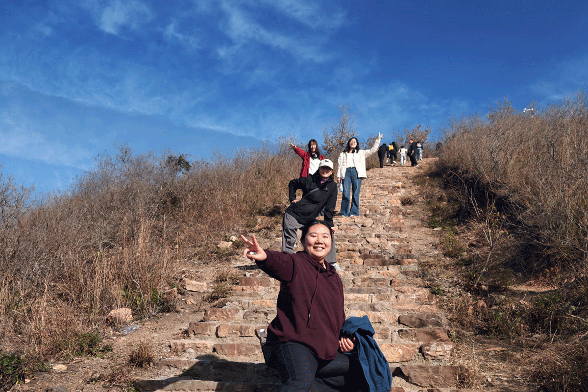 当日秋高气爽,晴空万里,微风裹挟着山间草木的清香拂面而来。阳光透过枝叶洒下斑驳光影,将石阶映得暖意融融,18℃左右的气温正是登山的好时节。队伍出发后,大家很快展现出不同状态:年轻同事精力充沛,沿着石阶快步向前,不时停下为身后同伴鼓劲;资深前辈稳扎稳打,边走边分享登山技巧,偶尔驻足欣赏山间秋景;几位爱美的女生则放慢脚步,举着手机捕捉黄叶、野果的灵动瞬间,时而拉着同伴合影,时而单独定格与秋景的同框,笑容格外灿烂。